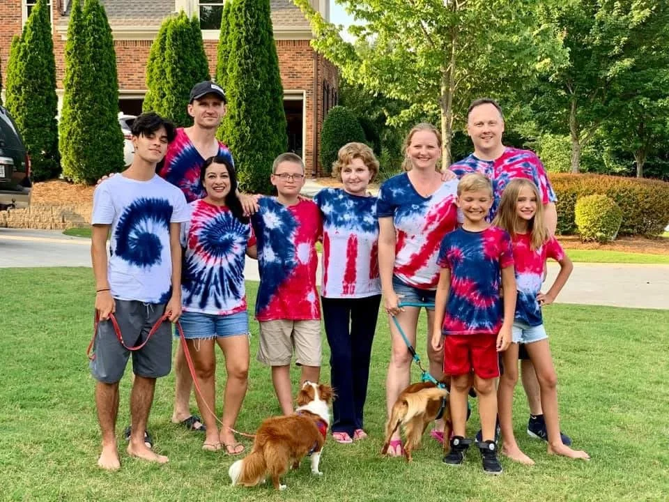 That summer, my brother and his family came in from Texas, and a close friend joined us. One afternoon, we spread everything out—shirts, dye, rubber bands, kids, laughter, dogs barking—and made red, white, and blue tie-dye together. It was messy, chaotic, and completely imperfect.