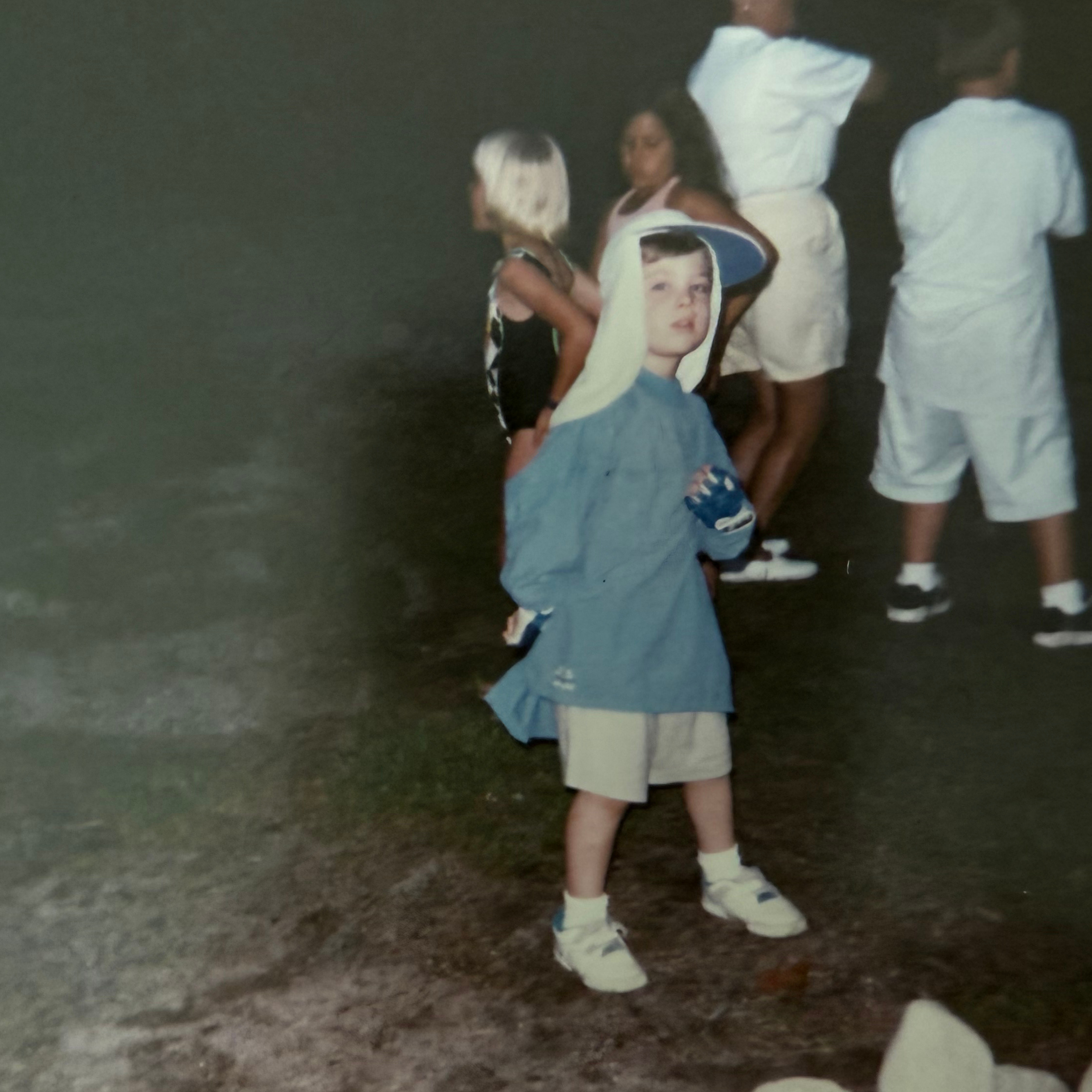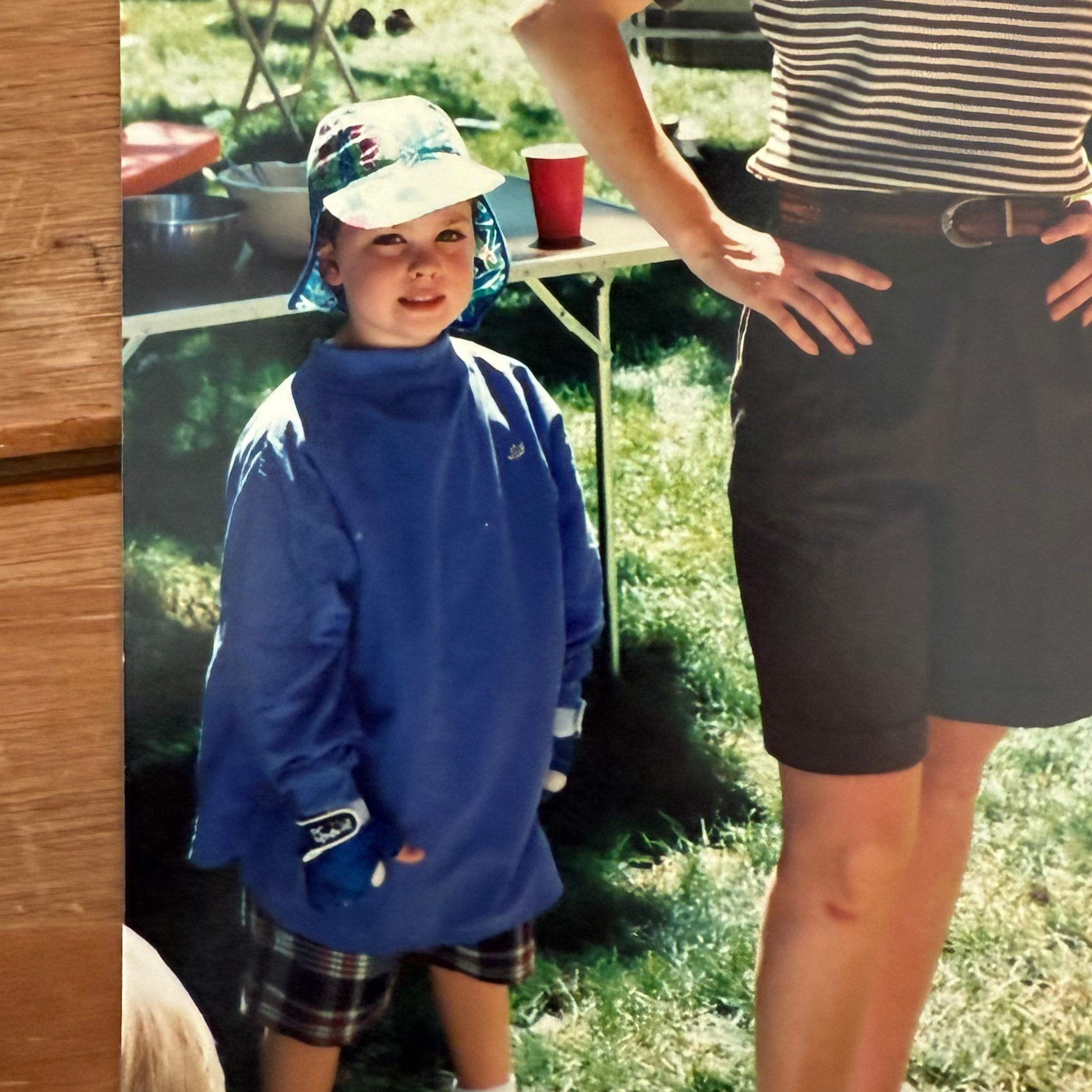 Craig as a child, outside in the sun wearing protective clothing.